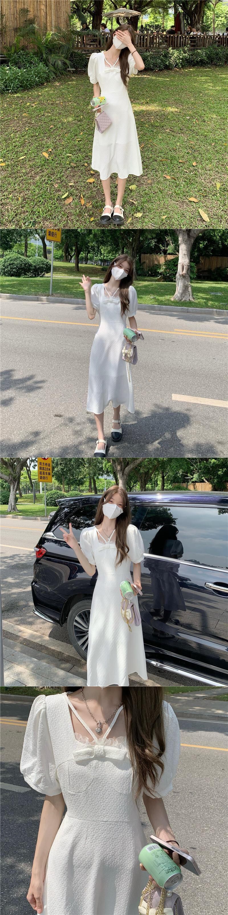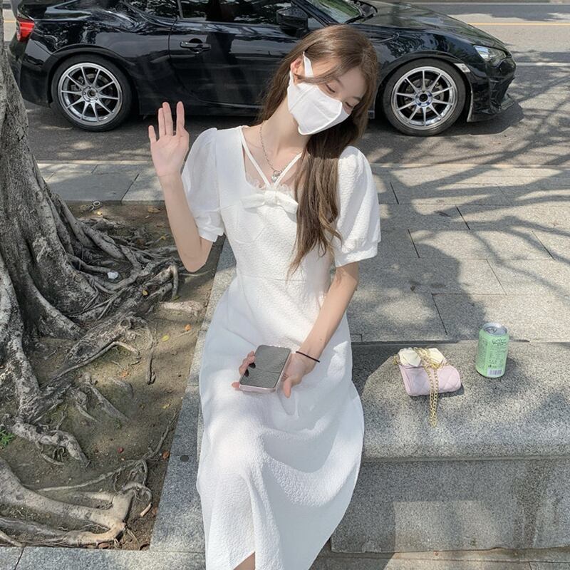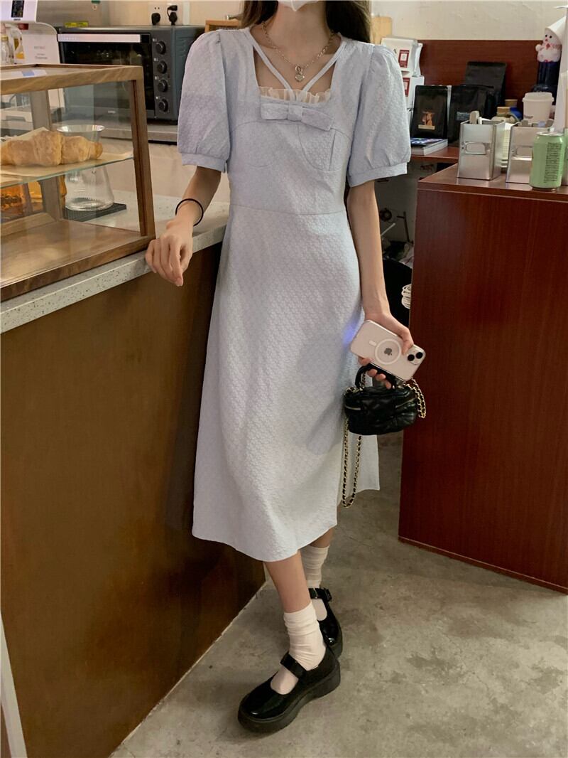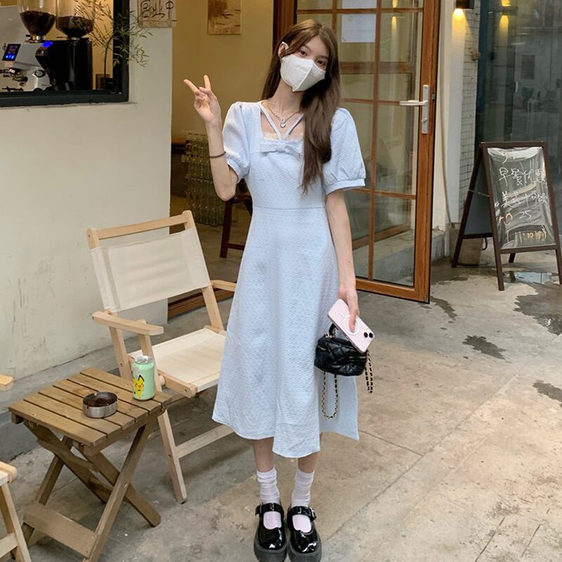 スリーブワンピース夏服韓国ファッションブルーロングスカート 大人ガーリー スウィート キュート カジュアル 夏物 SYJ62150575504