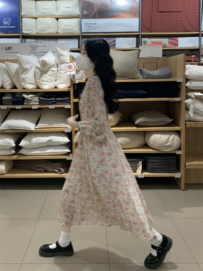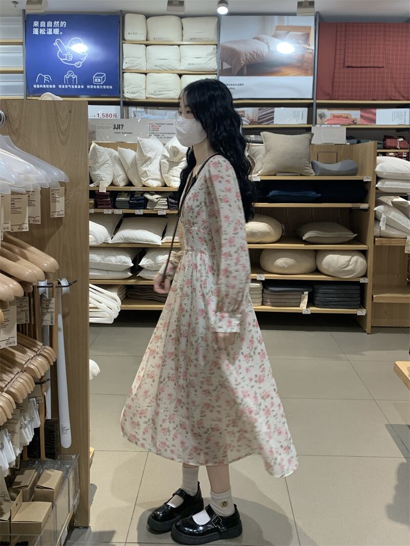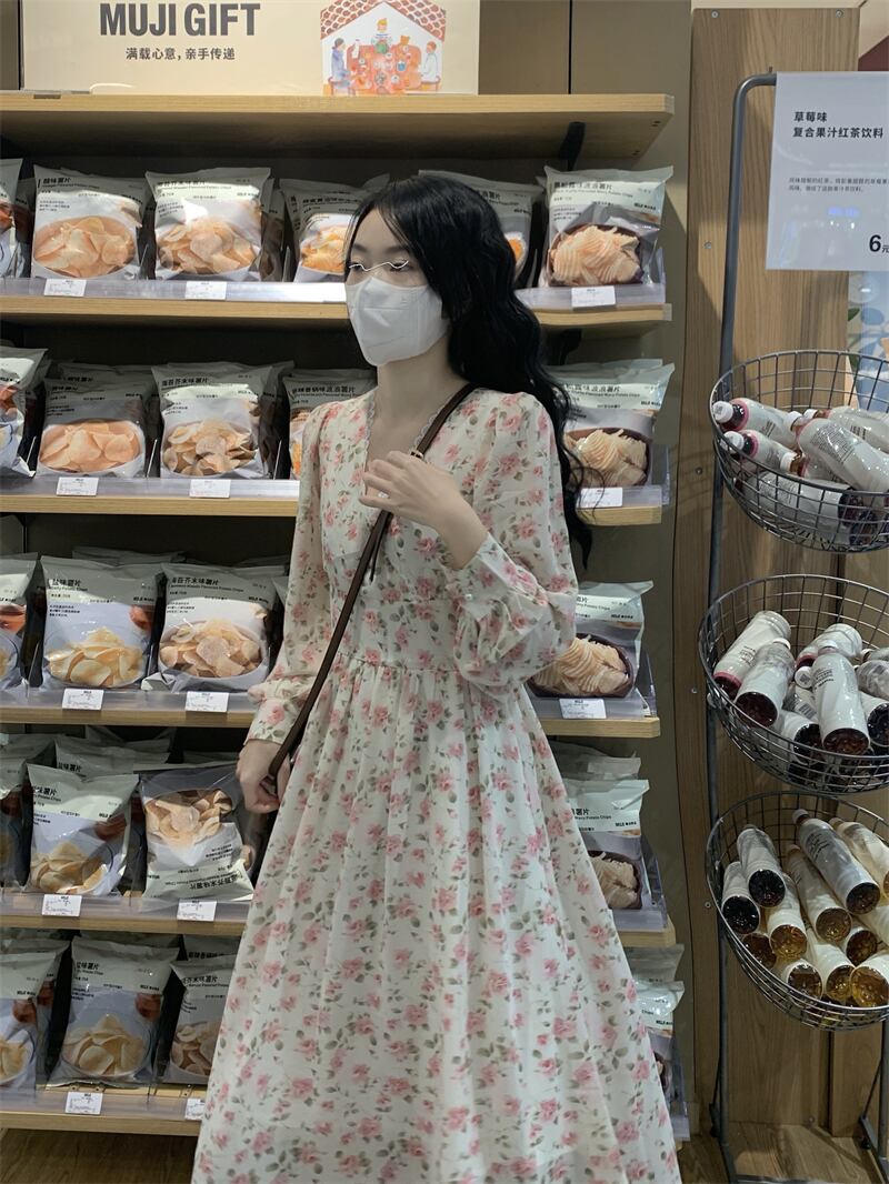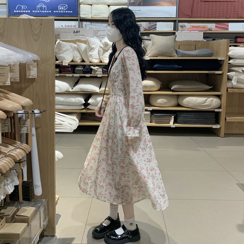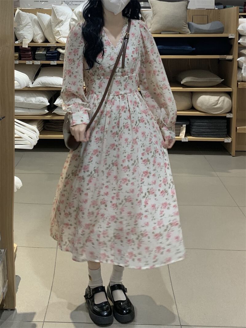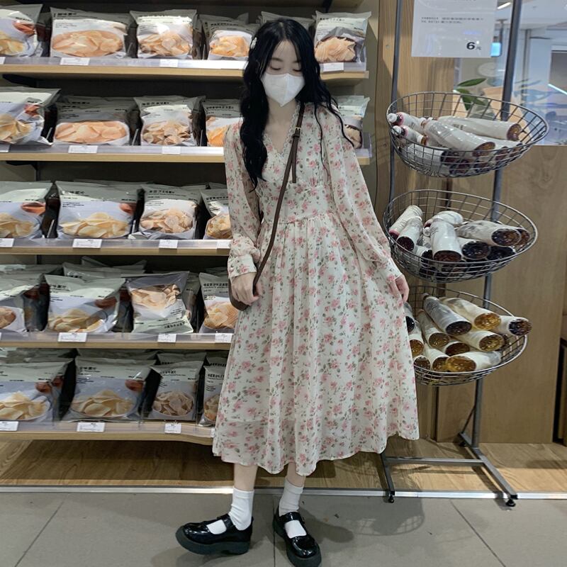 フローラルVネックワンピーススプリングスタイル薄手スカート 大人ガーリー スウィート キュート カジュアル 春物 花柄 SYJ7336356217