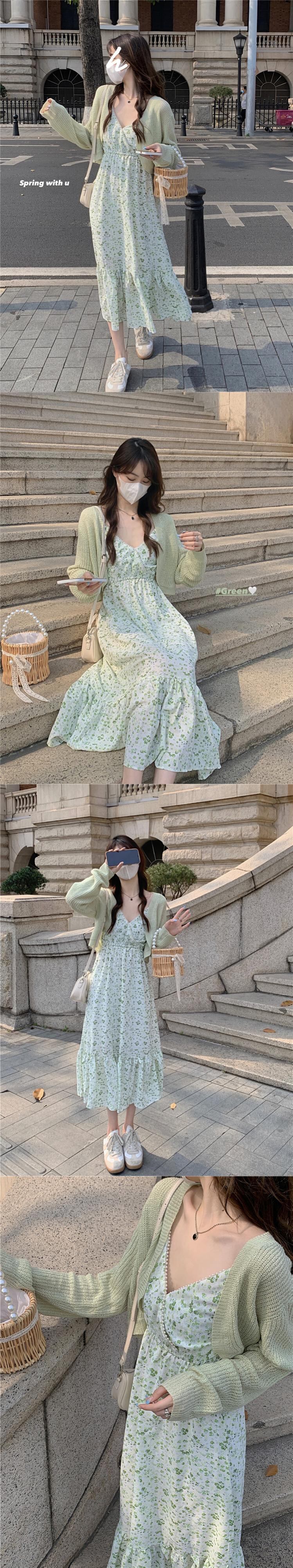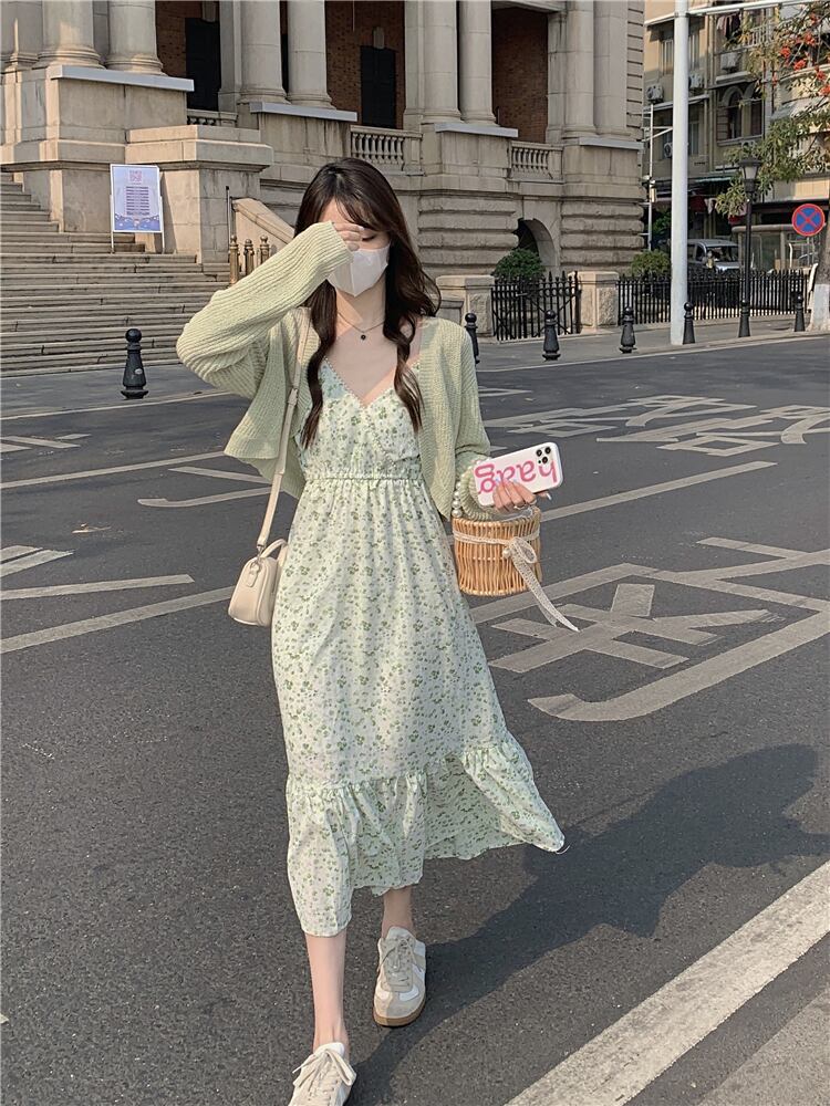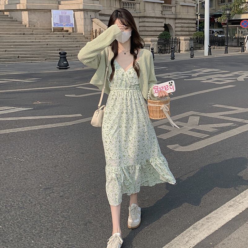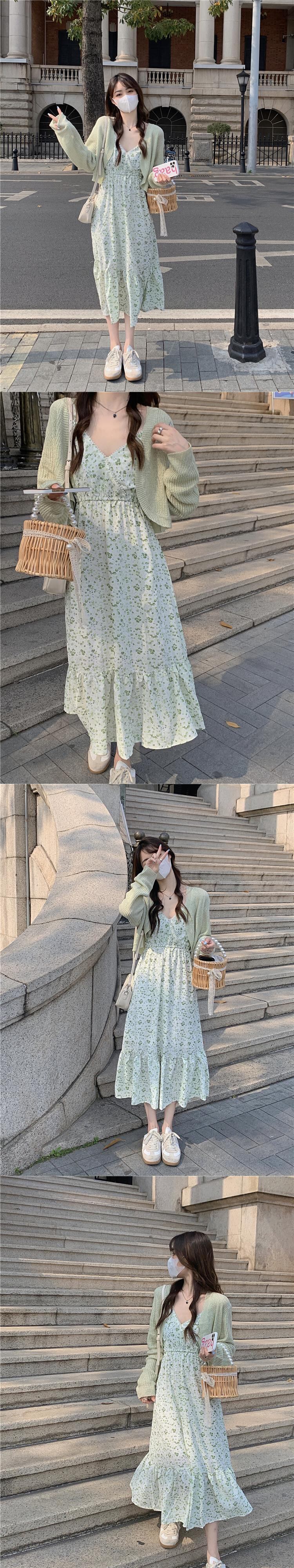 グリーンフローラルワンピースレディース夏服ロングスカート 大人ガーリー スウィート キュート カジュアル 夏物 花柄 SYJ40427741508