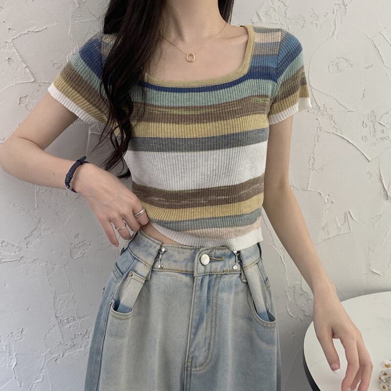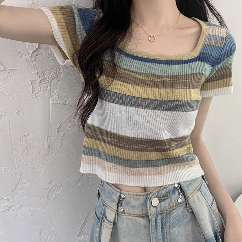 ストライプショートTシャツ夏服ニットトップス 大人ガーリー スウィート キュート カジュアル 夏物 スクウェア SYJ58246374429