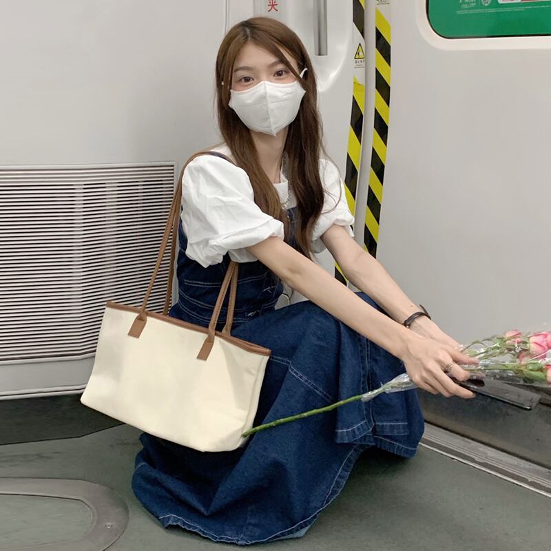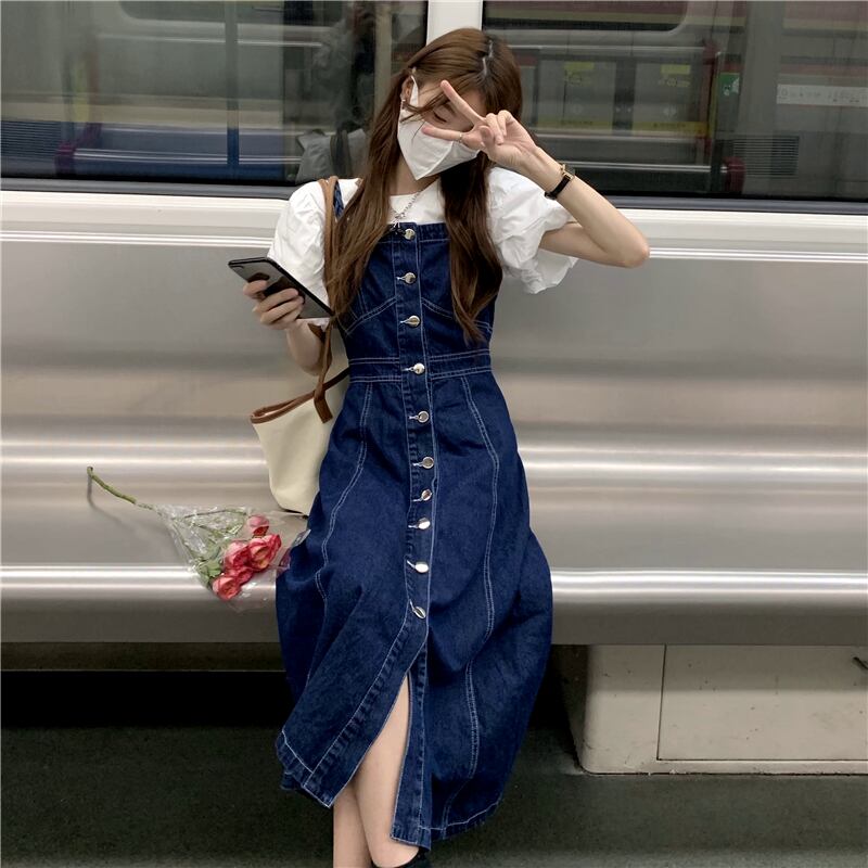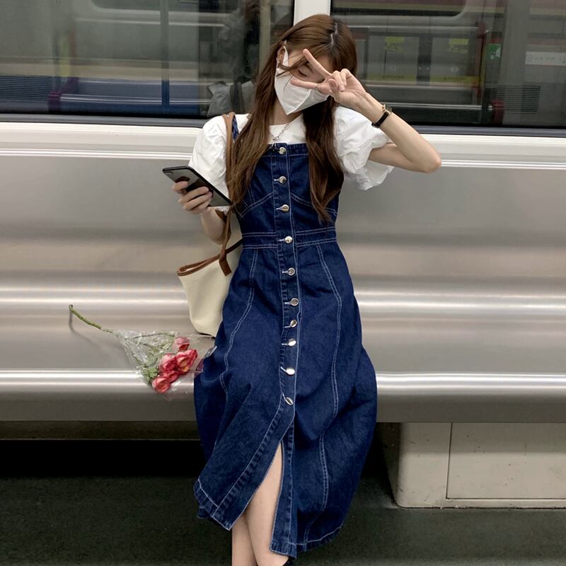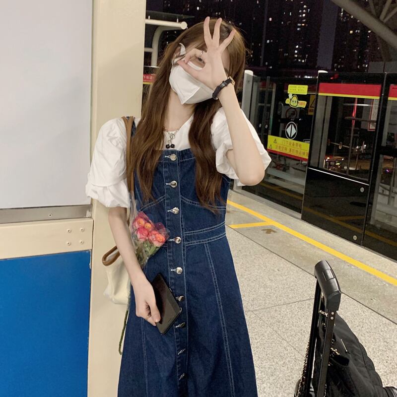 色:ブルーストラップワンピース,白いシャツのワンピース
