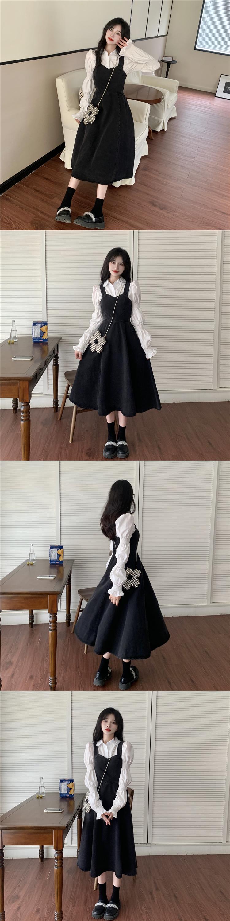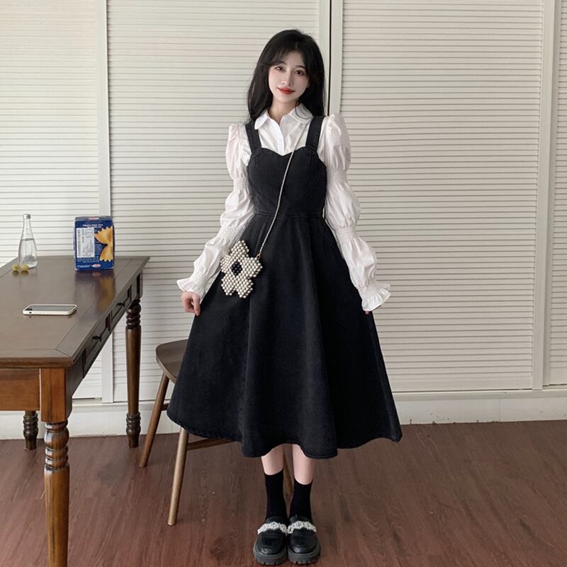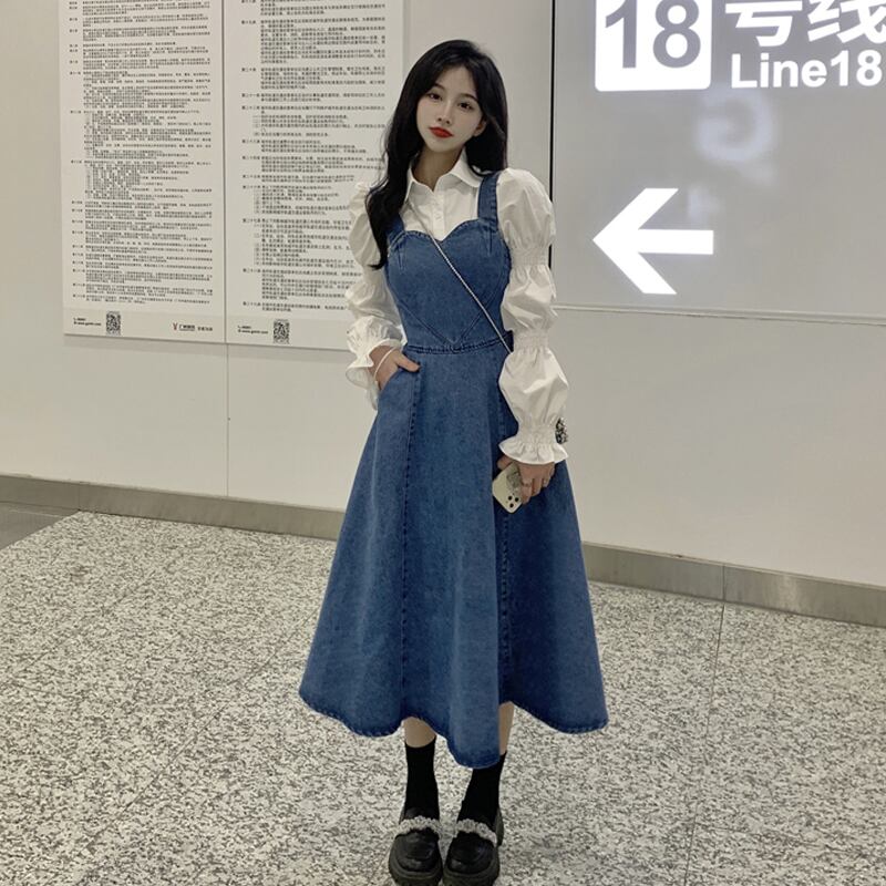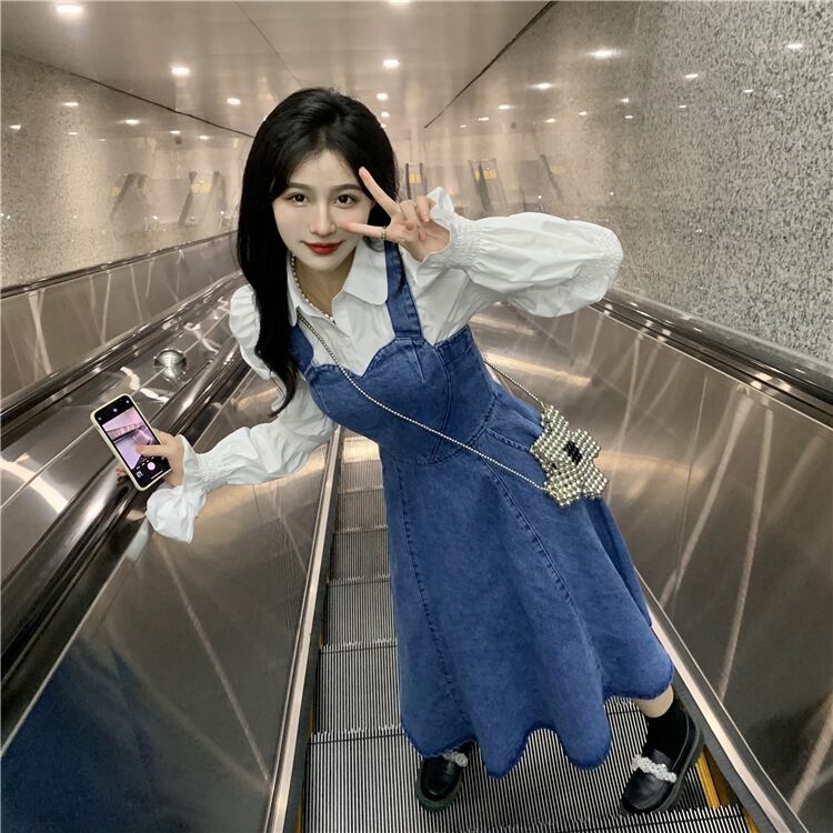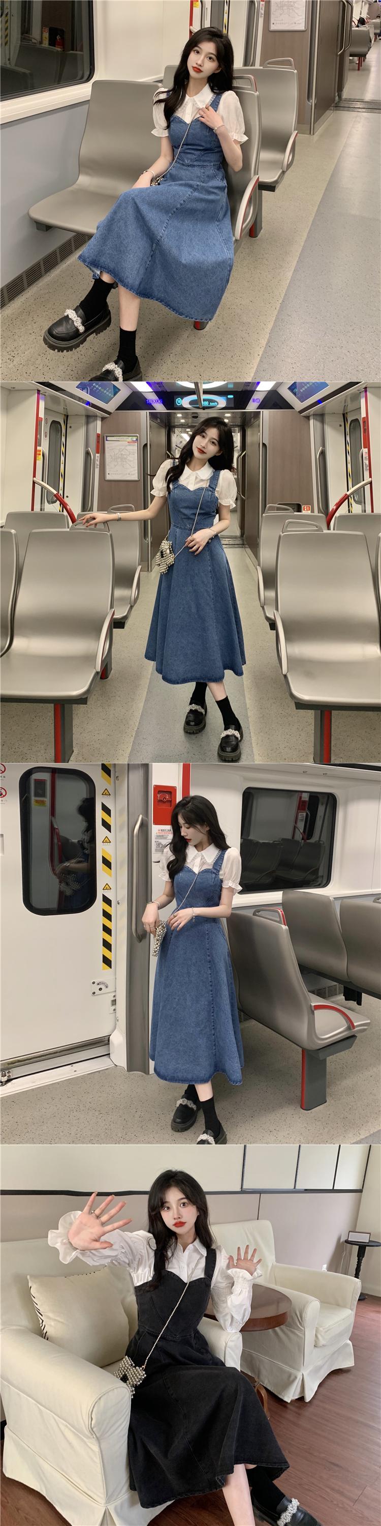 色:黒のデニムスカートのワンピース,ブルーデニムスカートのワンピース,ワンピースの白い長袖シャツ,ワンピースの白い半袖シャツ