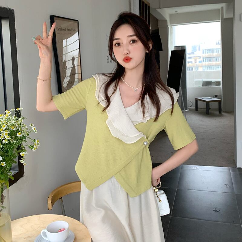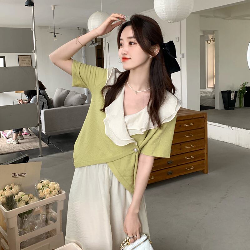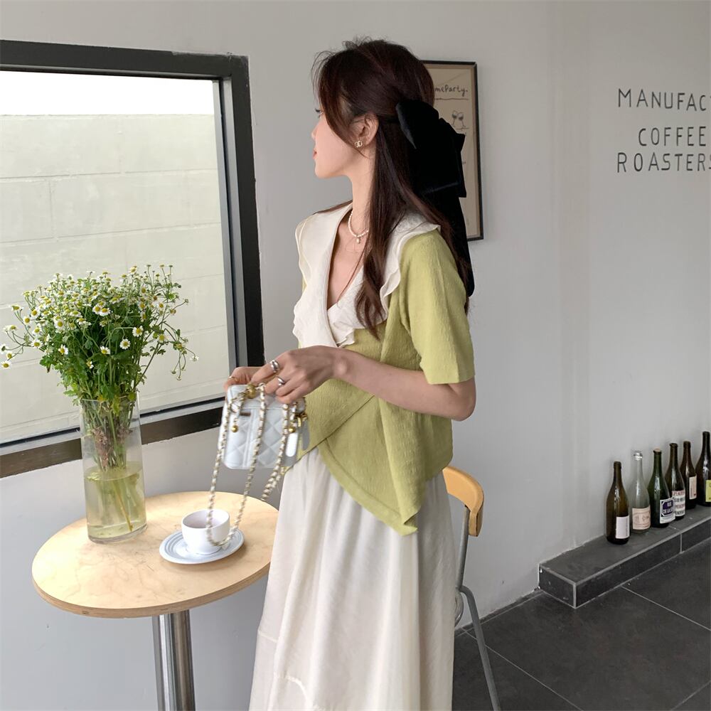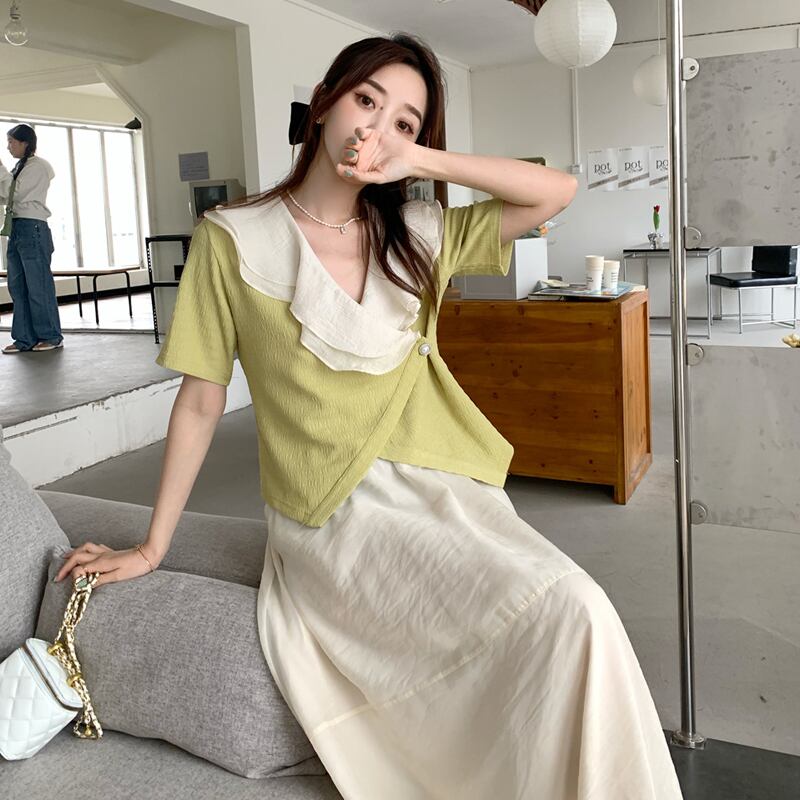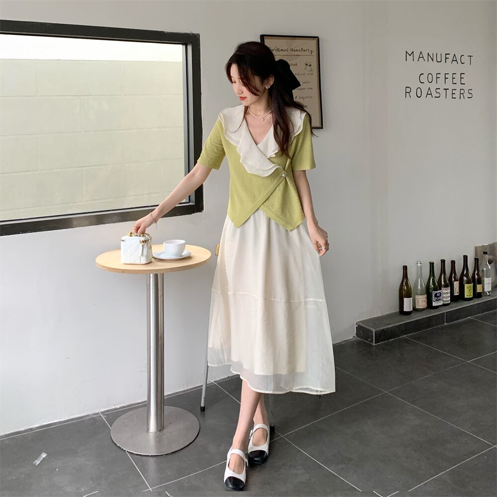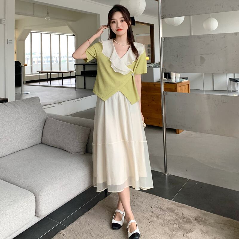 色:フルーツグリーンシャツワンピース,ワンピースアプリコットメッシュスカート