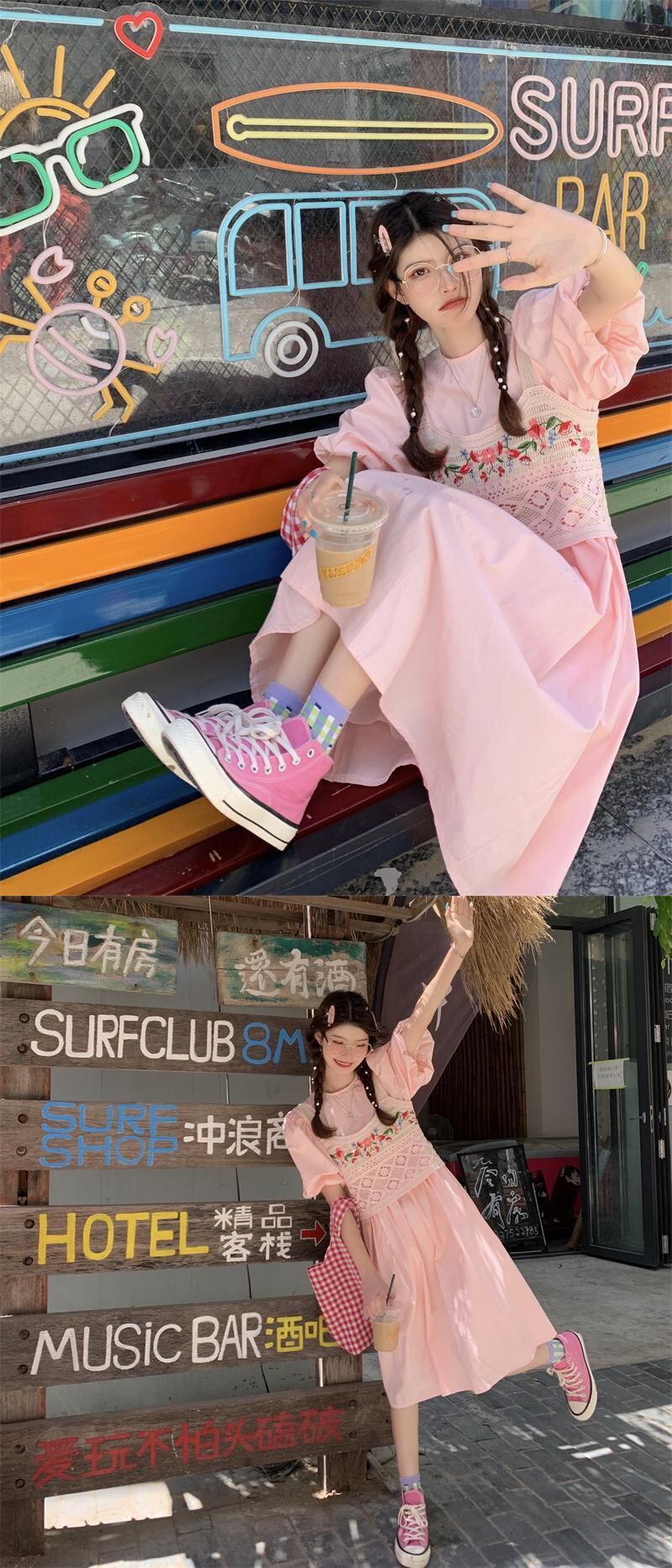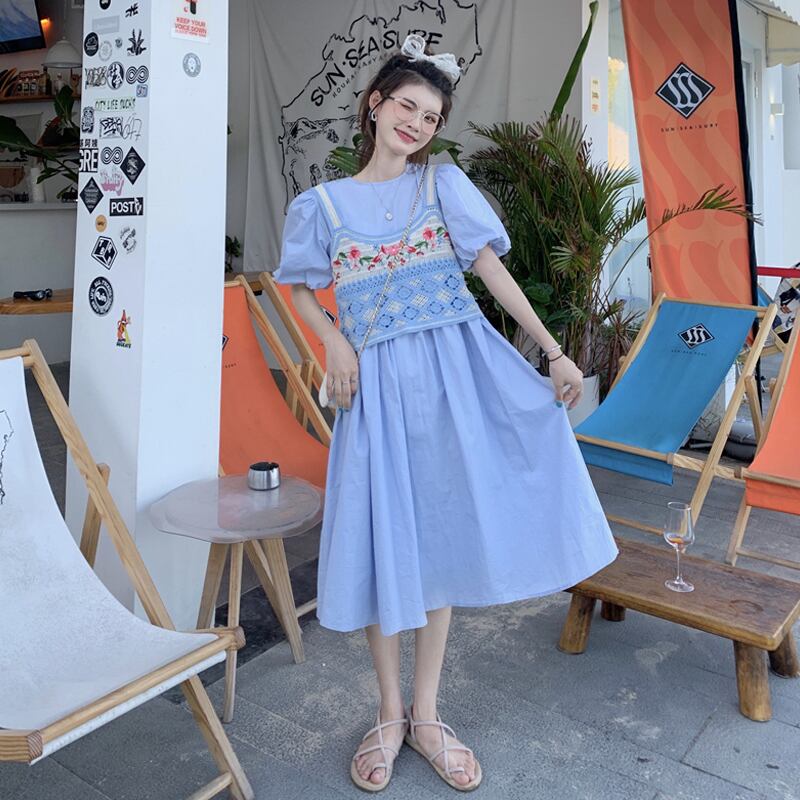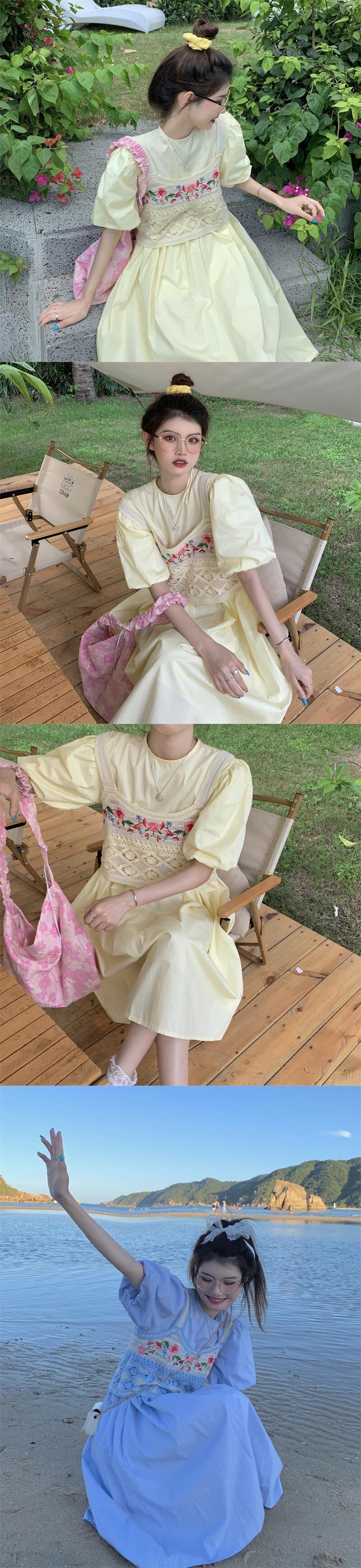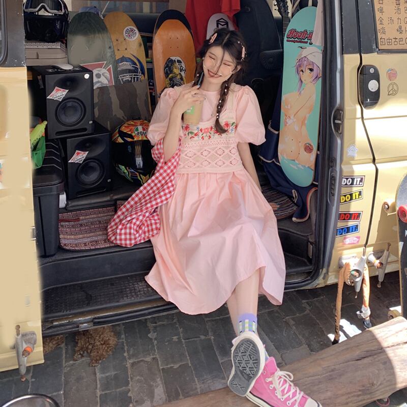 ワンピースレディース夏服スタイル韓国ファッションロングスカート ピンク 大人ガーリー スウィート キュート カジュアル 夏物 パフスリーブ SYJ7979331151