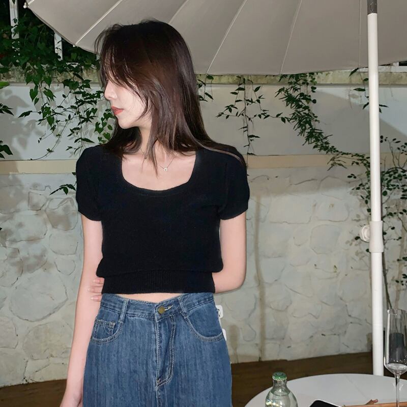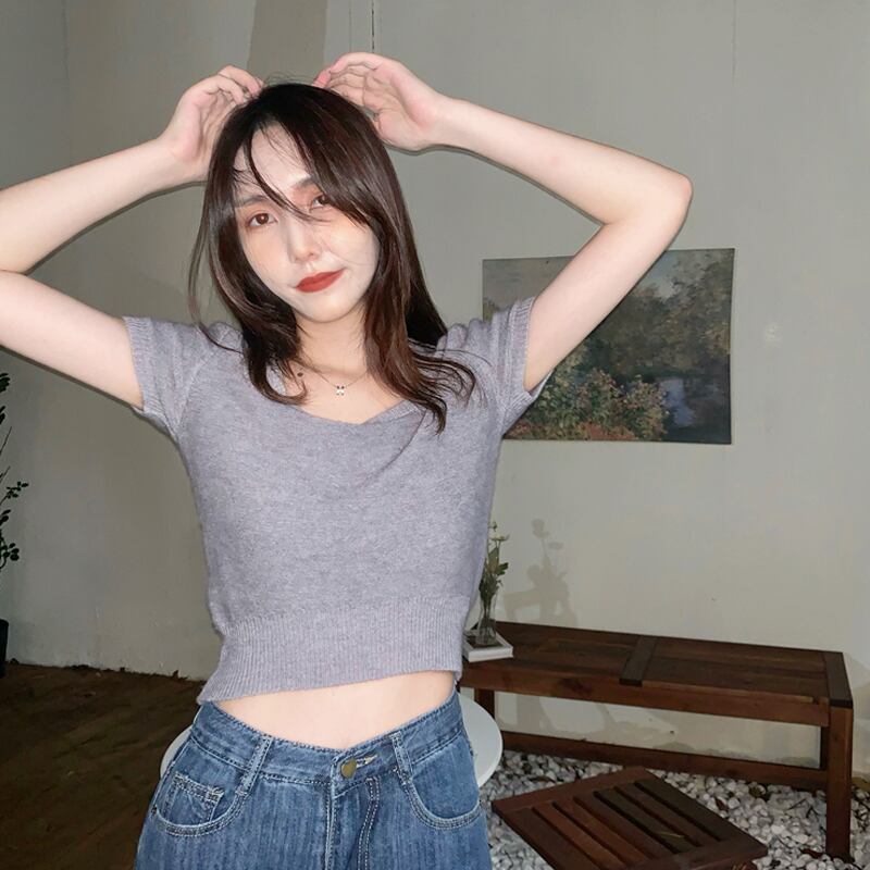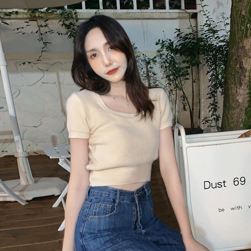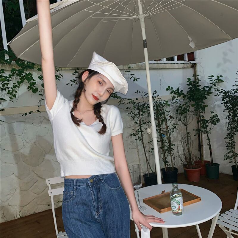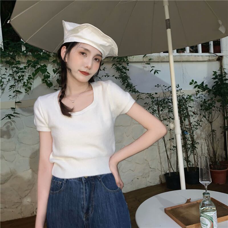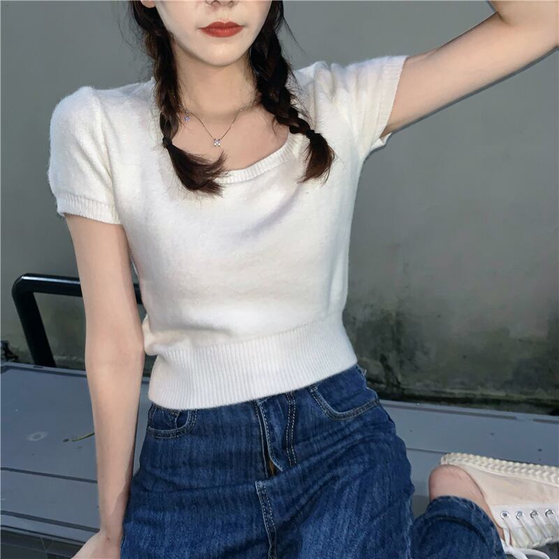 ホワイトショートニットTシャツシャツ 夏服ゆったりトップス 夏物 ピュア SYJ62794648293