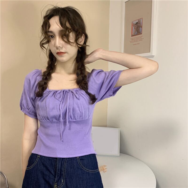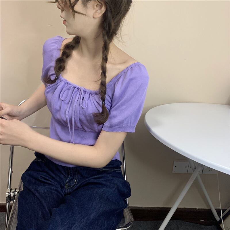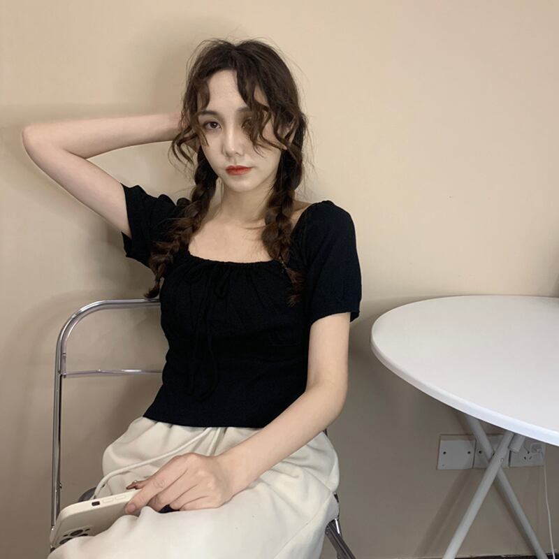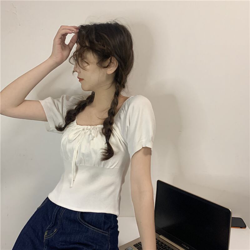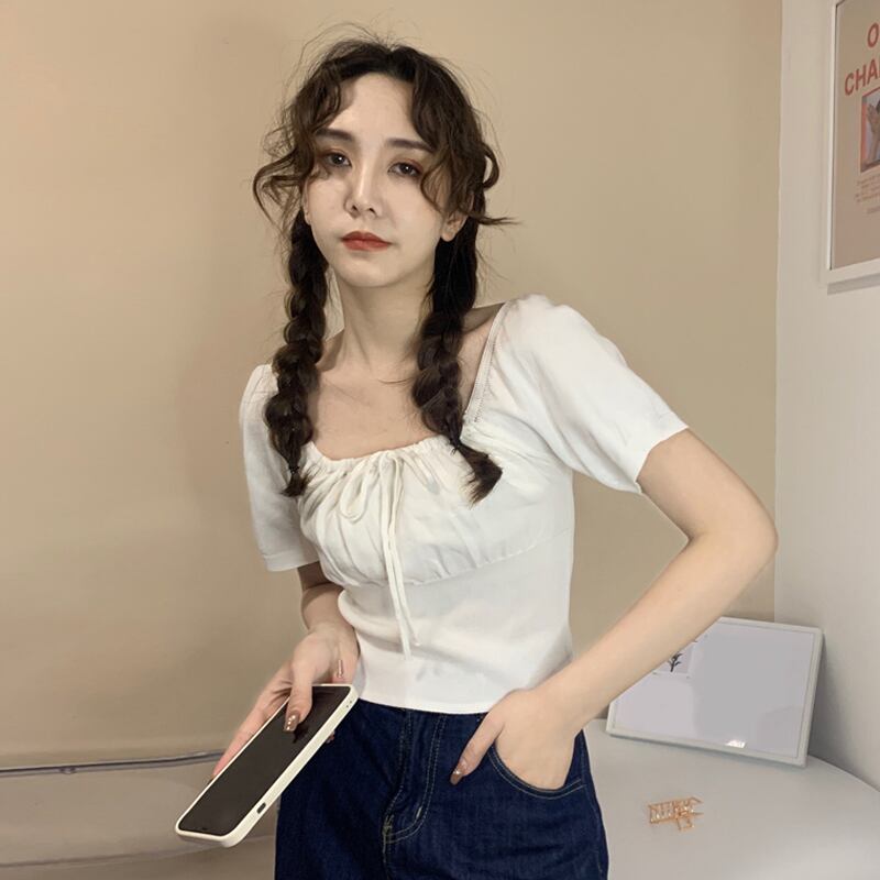 ホワイトショートTシャツ夏服ニットトップス 大人ガーリー スウィート キュート カジュアル 夏物 スクウェア SYJ54038436767