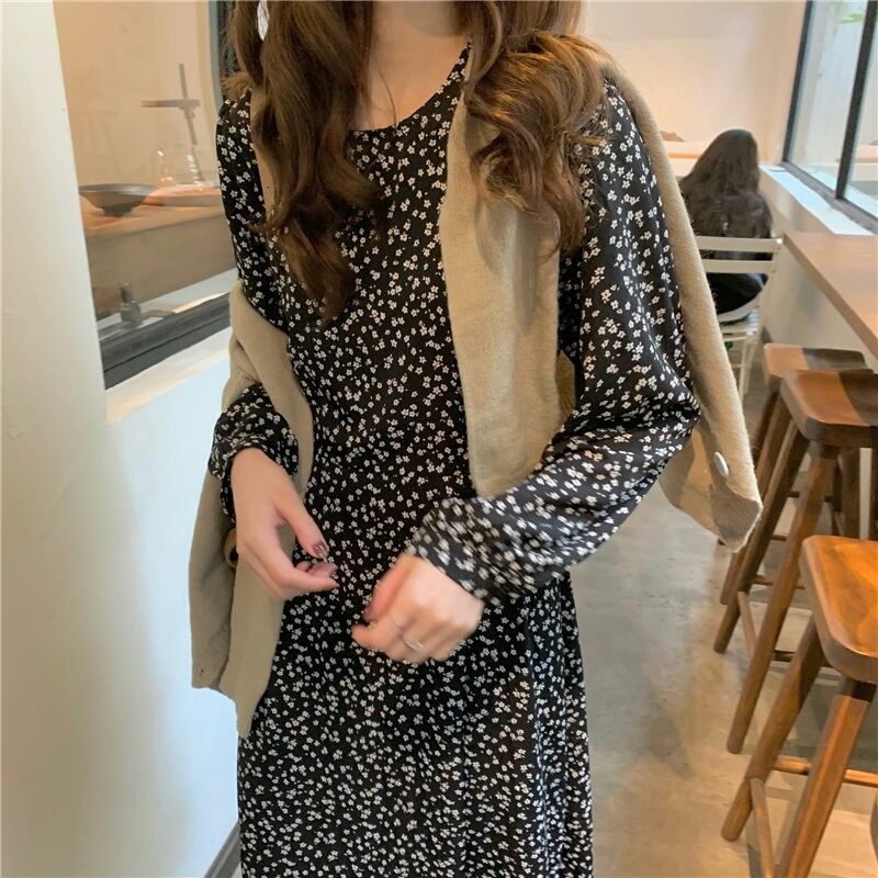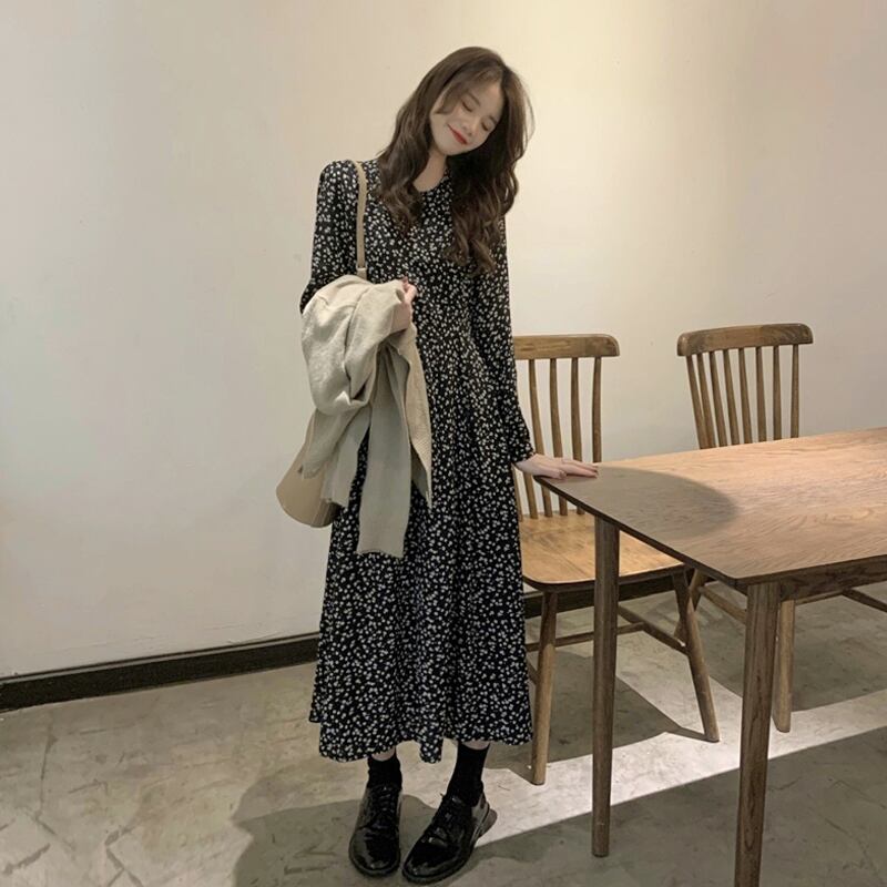 シフォンフローラルロングワンピーススプリング秋物スタンダードスカート レトロ 春物 オータム 花柄 長袖 SYJ97535331432