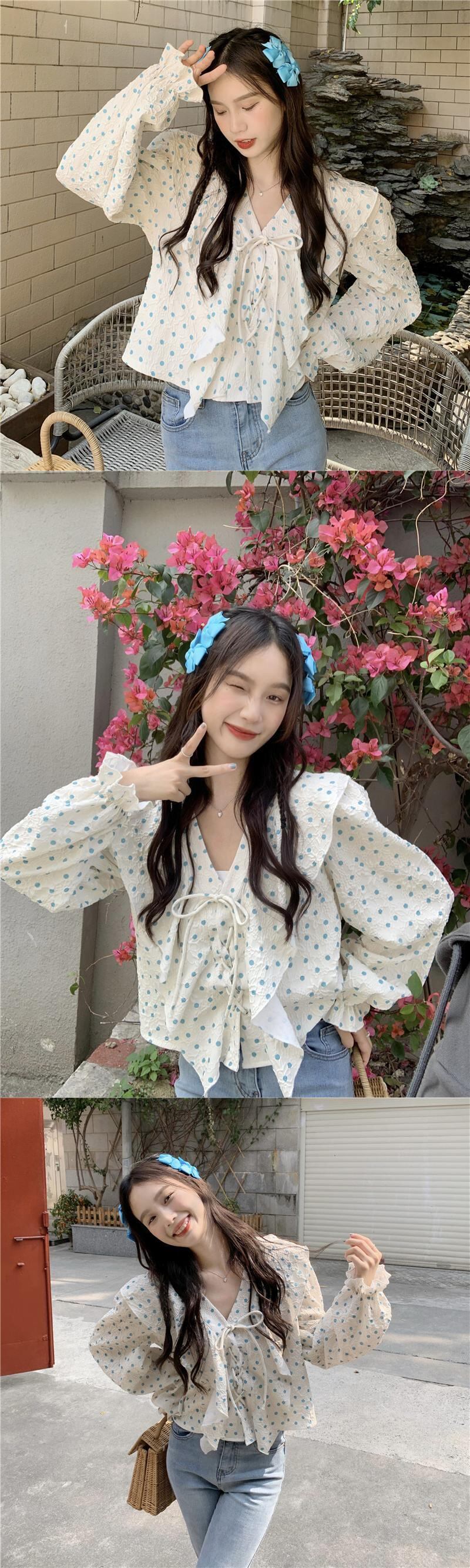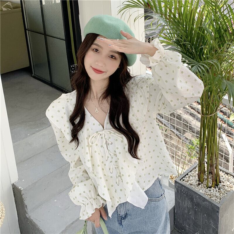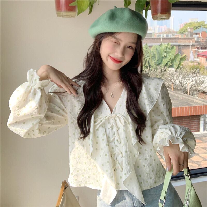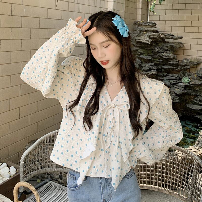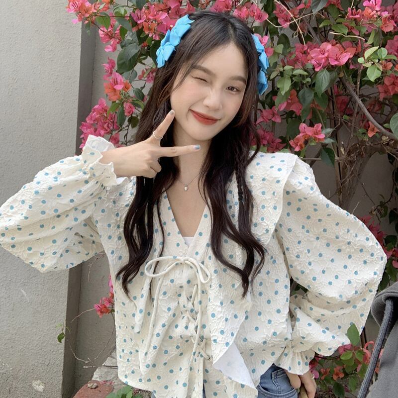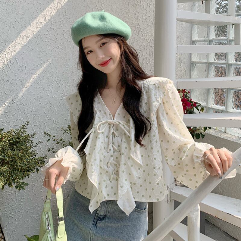 水玉Vネックシャツ スプリングトップス ロング 大人ガーリー スウィート キュート カジュアル 春物 長袖 SYJ5089532011