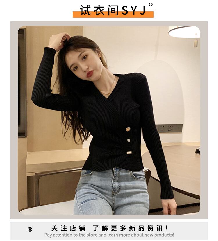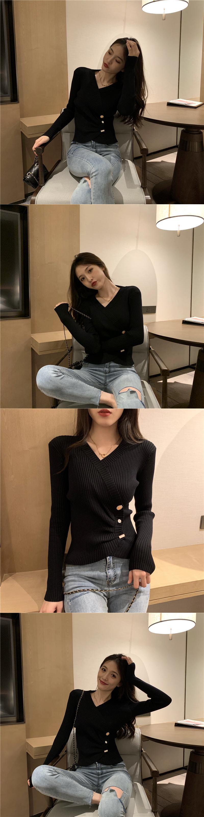 ブラックゆったりニットセーター スプリング秋物ウェストVネックトップス ロング 春物 オータム 長袖 ウエスト SYJ7882940272