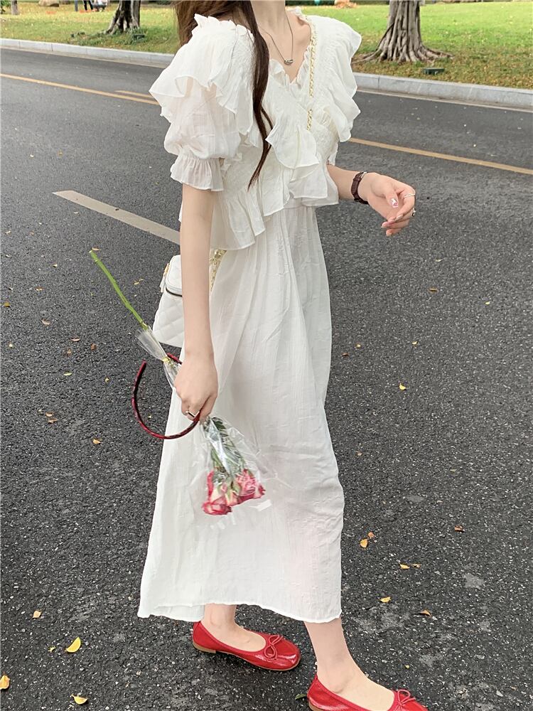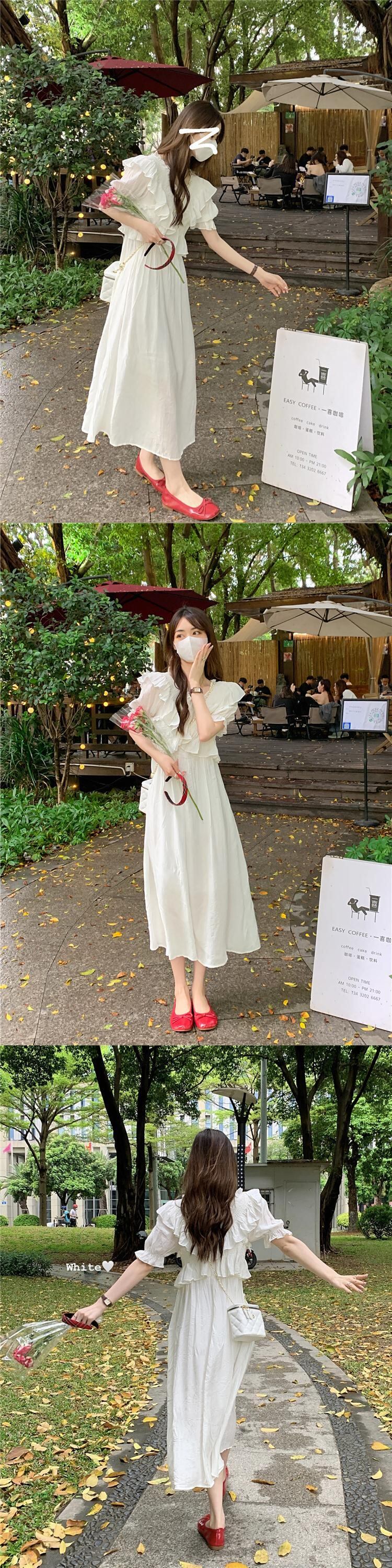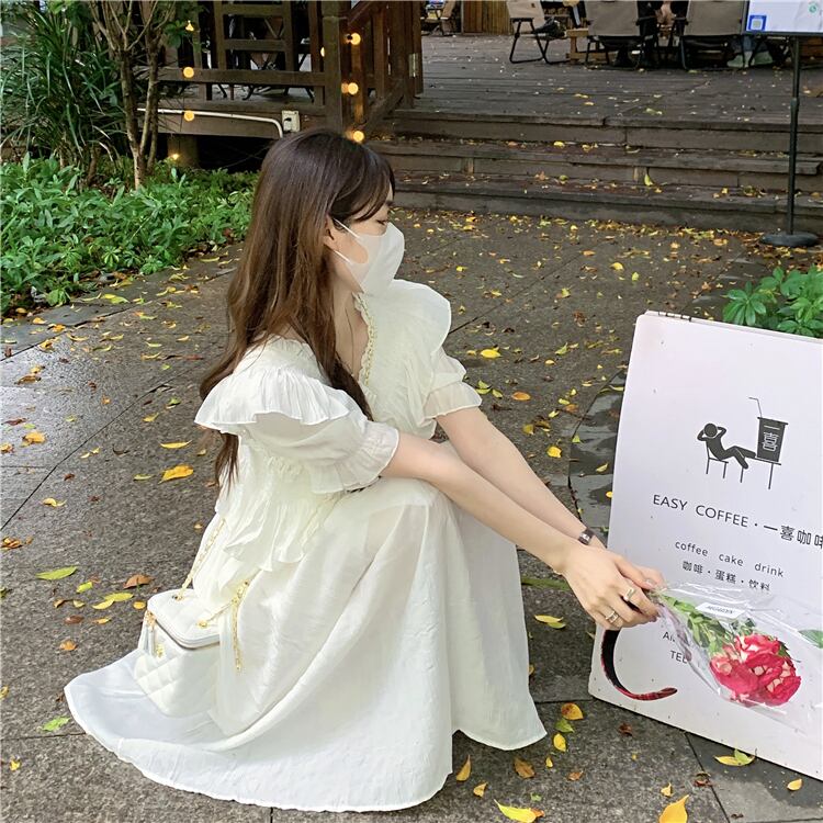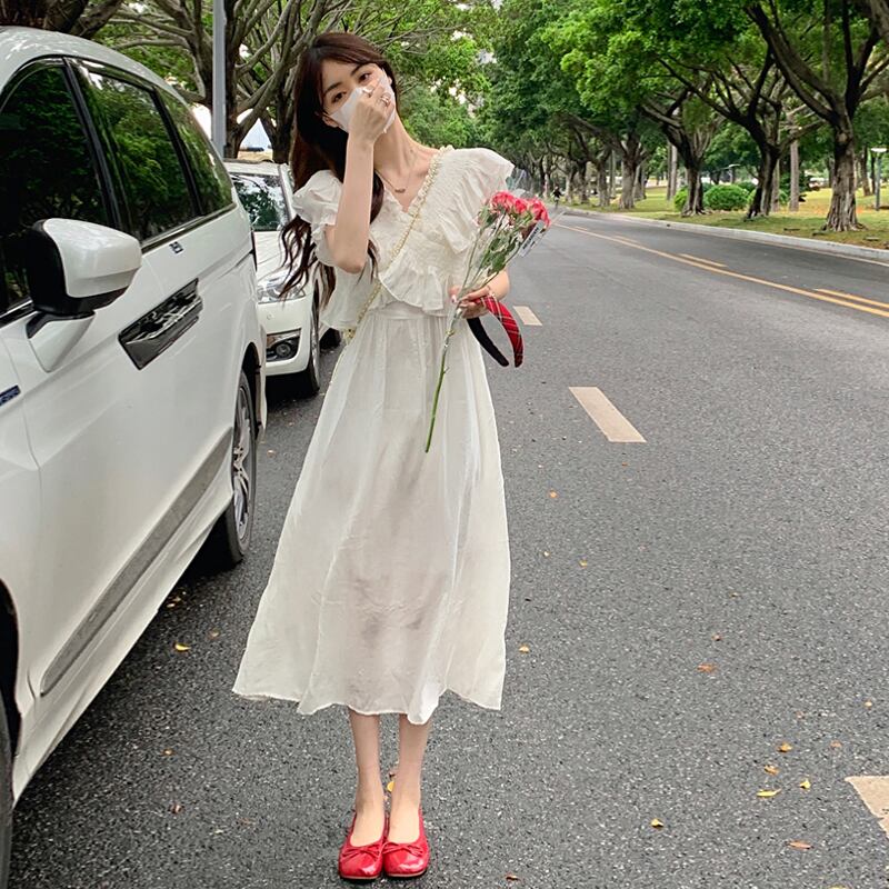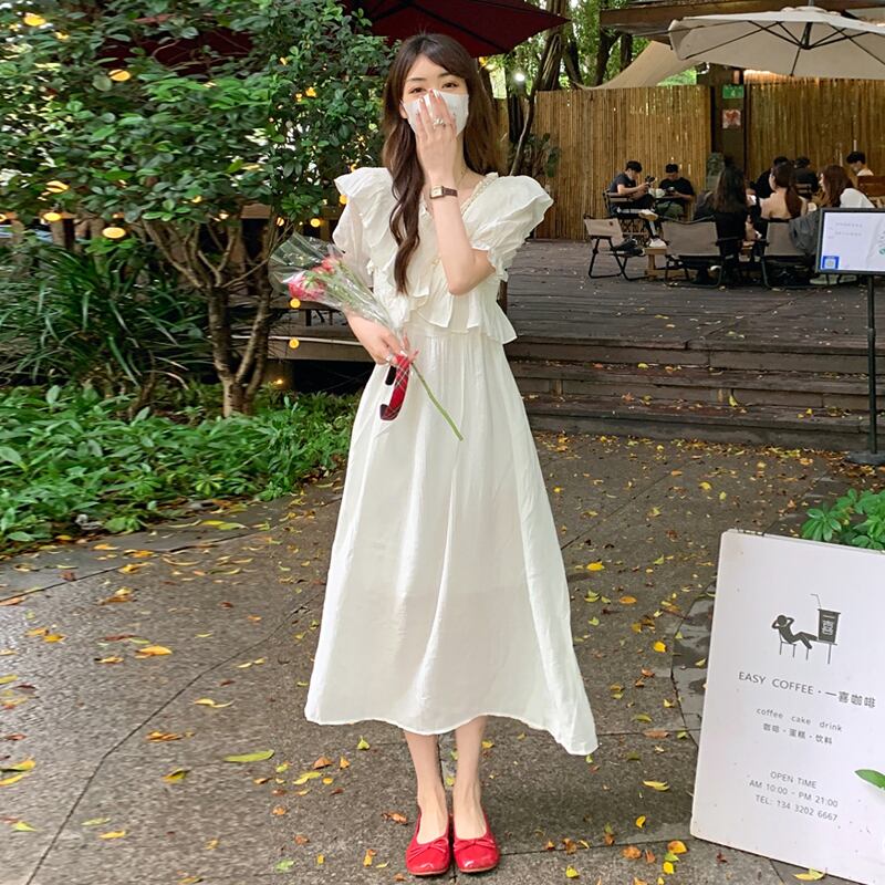 ホワイトVネックスリーブワンピース夏服スタイルウェストロングスカート 夏物 ウエスト SYJ90186389343