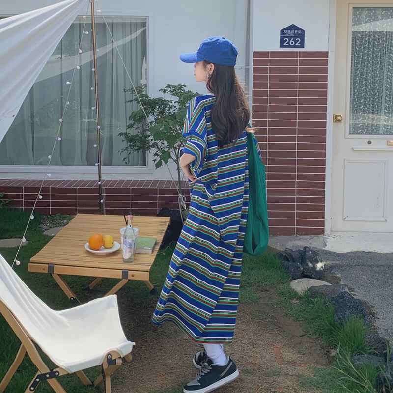 ストライプTシャツワンピース夏服スタンダードルーズロングスカート レトロ 夏物 SYJ16781366076
