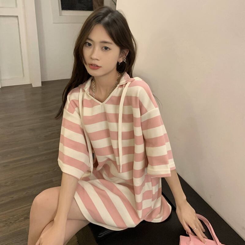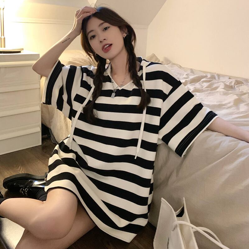 ストライプフードTシャツ夏服ルーズトップス 夏物 SYJ35535588104