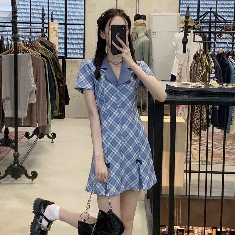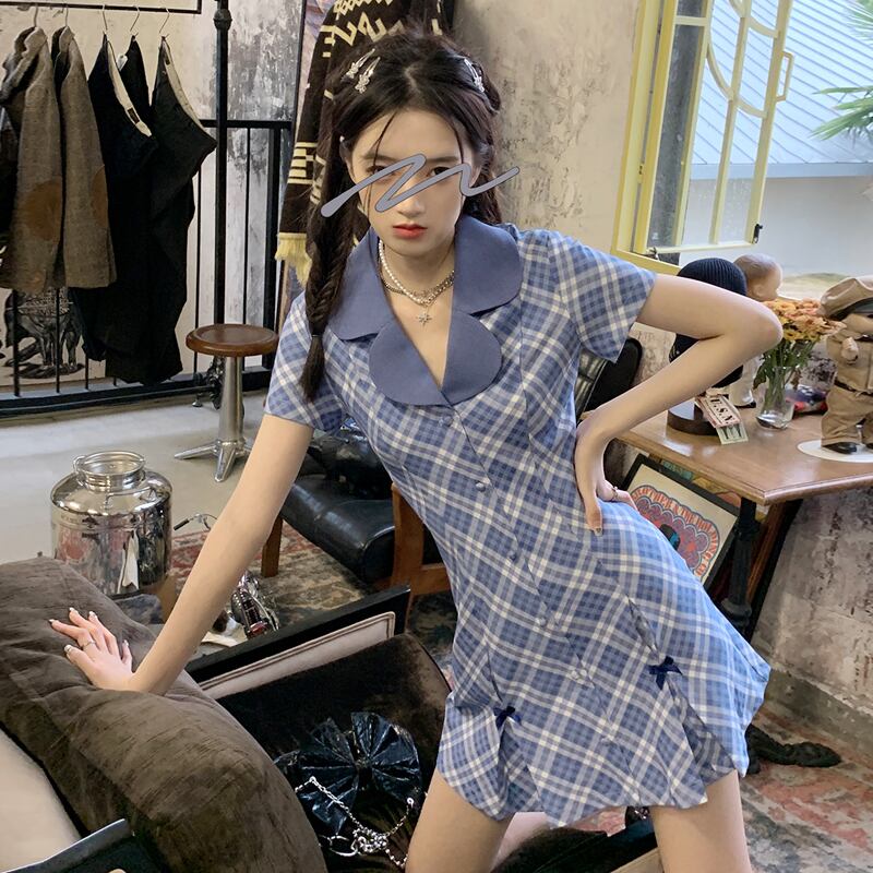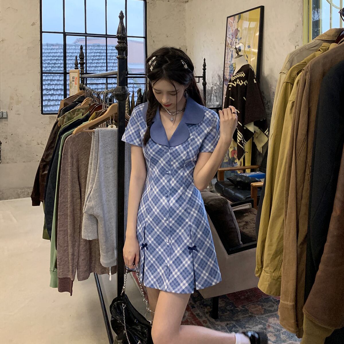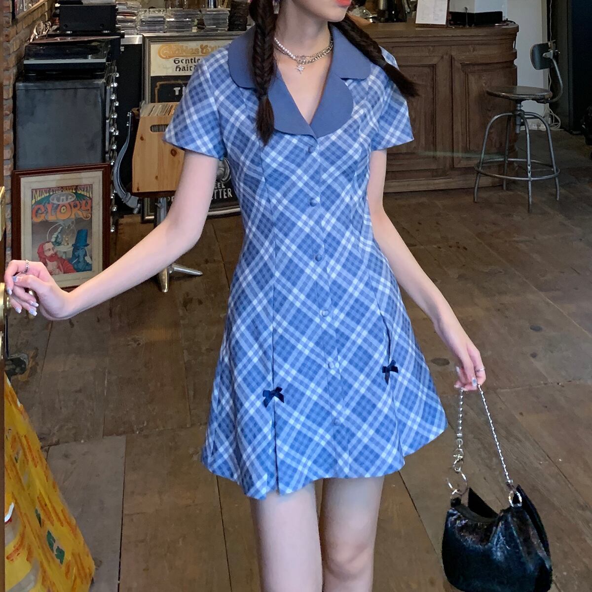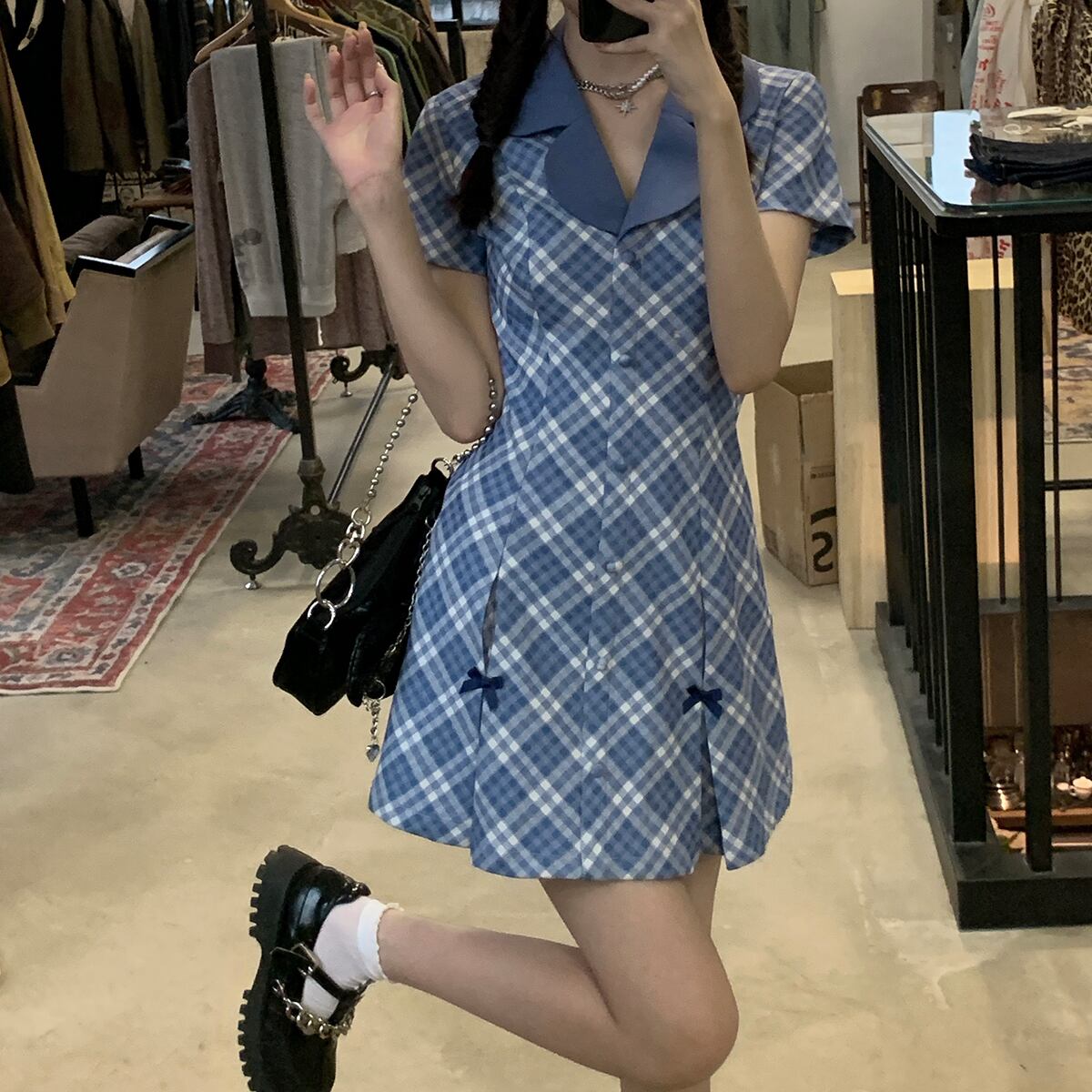 ブルー格子柄ワンピース夏服スリムショートスカート 夏物 SYJ51308217119