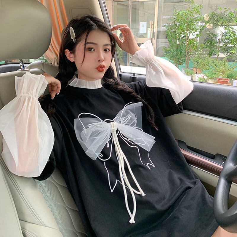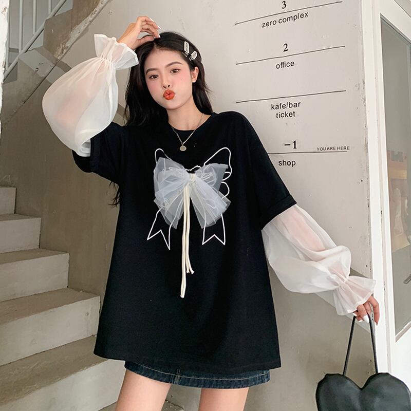 リボンTシャツ夏服ルーズ韓国ファッションオーバーサイズトップス 夏物 スタイル ミドル丈 SYJ9618206242